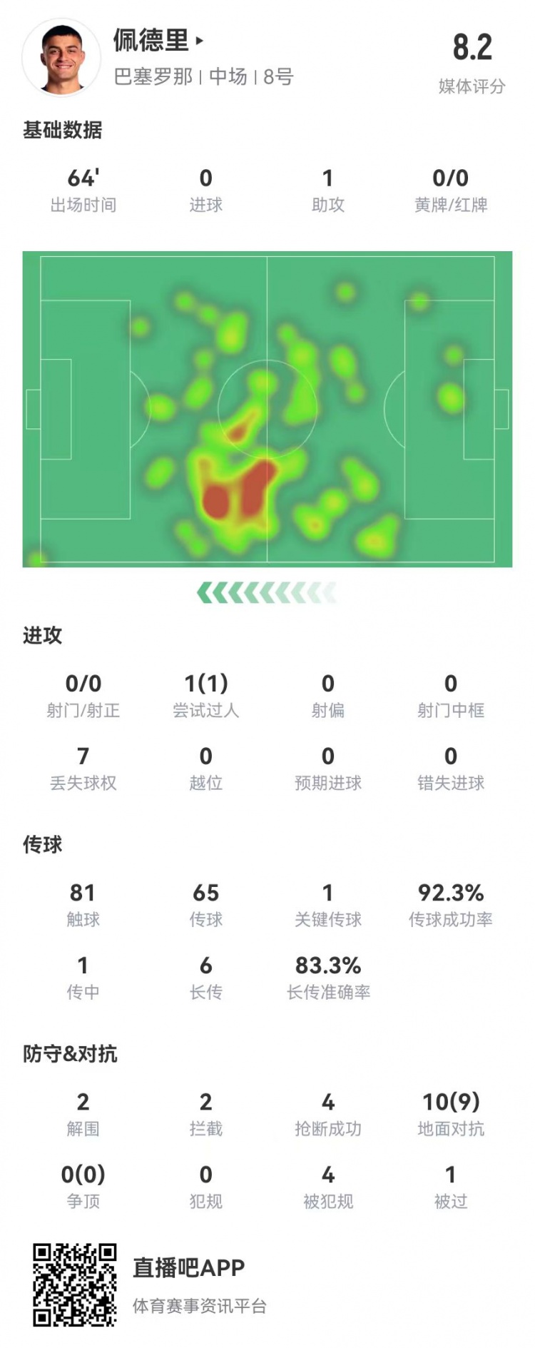 佩德里本场1助攻+5成功长传 10对抗9成功 4造犯规4抢断 获评8.2分 2月7日讯 巴萨在本轮国王杯5-0领先瓦伦西亚,佩德里本场数据如下:首发出战64分钟1助攻81触球65传球、60成功,成功率92%1关键传球1传中、0成功6长传、5成功1创造重大机会1过人、1成功10 2025/02/08