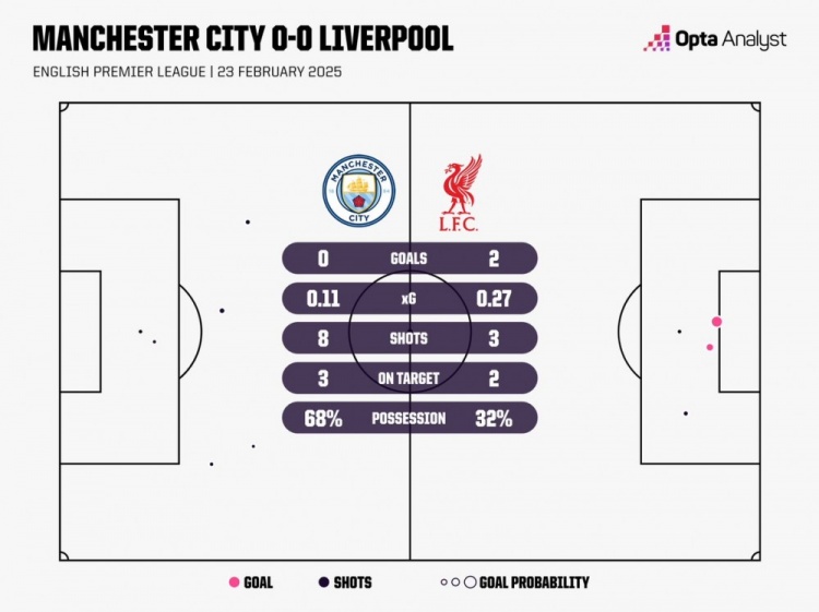曼城0-2利物浦半场数据:控球率68%-32%,射门8-3,射正3-2